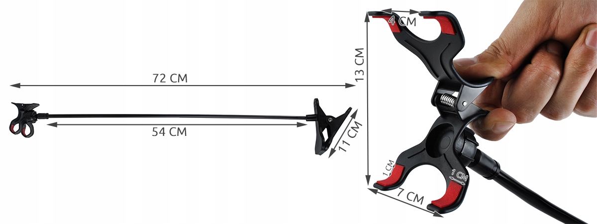 - SPECYFIKACJA – kolor czarny; długość całkowita 72cm; maksymalny rozstaw uchwytu 13cm; maksymalny rozstaw klipsa 7,5cm; obrotowa głowica 360 stopni; waga 125g.